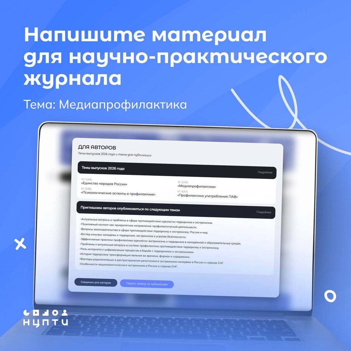» 📘 Тема будущего выпуска — медиапрофилактика. Ждем материалы, посвященные созданию профилактического контента и исследованию его восприятия молодежью. Также ждем интересные примеры, как студентов вовлекают в создание социально значимого контента. Подать заявку можно на сайте до 10 мая. Ссылка: нцпти.рф/журнал (Раздел «Для авторов»). 💬 НЦПТИ 📲 Мы в МАХ | #нцпти_аналитика #нцпти_профилактика