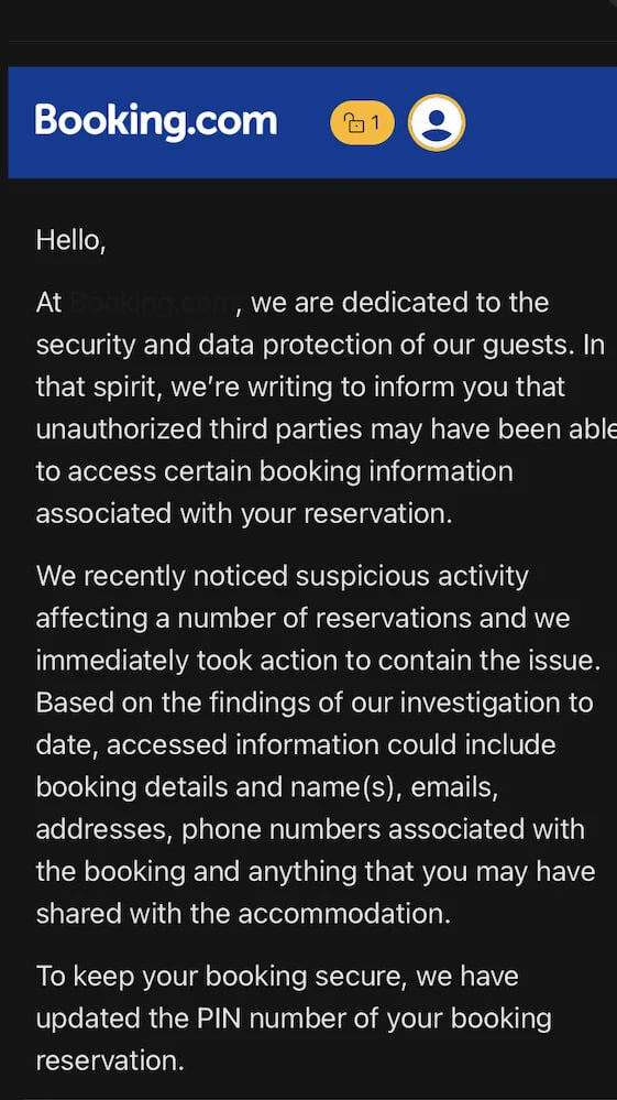• Один из крупнейших в мире сервисов для бронирования отелей, Booking, был взломан. Сервис разослал соответствующие уведомления пользователям по электронной почте (фото). • В письме сказано, что злоумышленники получили информацию о бронировании отелей, именам пользователей, их номерам телефонов и почтовым адресам. Пока масштаб утечки неизвестен, однако такую рассылку получили только жители Австралии. • Сам сервис сообщает, что ситуация под контролем, а пользователям рекомендуют не переходить по ссылкам из писем "от отелей" и перепроверять любые сообщения о бронированиях. ➡️ Источник. #Новости