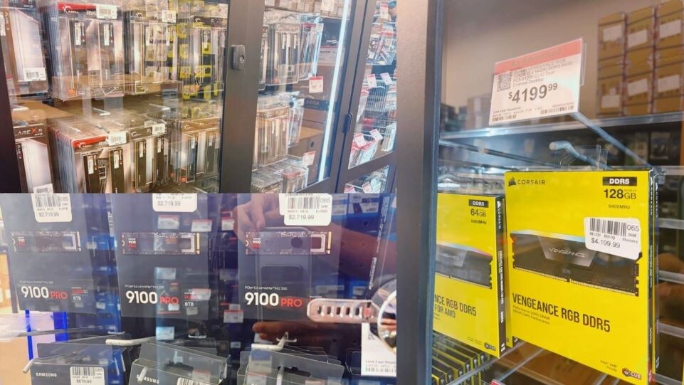 Кризис в индустрии памяти ударил по потребителям. Центры обработки данных и компании из сферы искусственного интеллекта скупают все запасы, а производственные мощности переходят на высокоскоростную память HBM. Фото: Reddit/Hell-Diver 7 Пользователь Hell-Diver 7 опубликовал на Reddit снимки из магазина Micro Center. На фотографиях видны шкафы и стеллажи, полностью забитые модулями DDR5 и SSD. Купить все это не проблема, вот только все цены выросли более чем на 200% относительно периода до начала текущего кризиса. Комплект Corsair Vengeance RGB на 128 ГБ с частотой DDR5-6400 стоит $4199,99. Фото: Reddit/Hell-Diver 7 Твердотельные накопители тоже стоят дорого. Samsung 9100 Pro PCIe Gen5 продают за $679,99 за 2 ТБ и за $2719,99 за 8 ТБ. Накопитель Sandisk WD_Black SN8100 на 2 ТБ обойдется в $690,99, а модель на 4 ТБ — в $1272,99. Правда, на четырехтерабайтную версию действует скидка: ее отдают за $699,99, что дешевле на $573. Обычные потребители и геймеры теперь вынуждены пересматривать бю