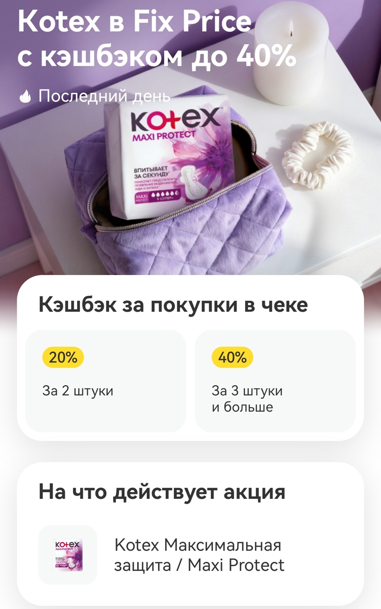 Если купите в Fix-Price две упаковки Kotex и расплатитесь картой Т-Банка, то обратно получите 20% от покупки. Но выгоднее брать сразу три пачки, ведь за них придет уже 40% кешбека. А это такой товар, что всегда нужен.
