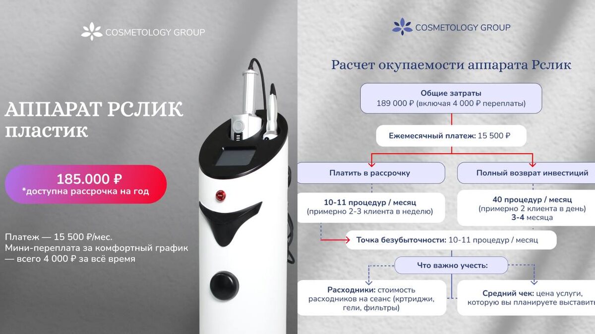 ! 🔥 Рслик пластик — доступен на максимально выгодных условиях: ▪️Рассрочка на 1 год ▪️Платеж: всего 15 500 ₽/мес. ▪️Мини-переплата за комфортный график — всего 4 000 ₽ за ВЕСЬ период. ▪️Принимаем к оплате кредитные карты. Это не просто покупка, это инвестиция, которая окупает себя сама. Всего 10–12 процедур в месяц полностью закрывают платеж по рассрочке, а всё остальное — ваша чистая прибыль! Не откладывайте рост вашего бизнеса на потом. Забронируйте аппарат по лучшей цене прямо сейчас 🤩