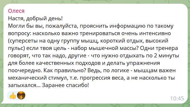 Недавно мне поступил такой вопрос. Он очень интересный, и ответ я решила сделать в форме новой статьи. Итак, погнали разбираться! Для роста мышц действительно важен механический стимул. Но с весами есть тонкий момент. Многие зацикливаются на прогрессии и думают, что чем они больше поднимут, тем быстрее вырастут мышцы. Логика понятна, но на практике это работает не совсем так. Для мышцы важно не столько то, какой вес стоит в тренажёре, сколько то, как вы её прорабатываете в каждом движении. Возьмём, например, тягу верхнего блока. Вы подтянули рукоять к себе и мышца сократилась. И в этот момент важно почувствовать именно её работу: не руки, не кисти, не трапецию, а конкретно широчайшую мышцу спины. Затем вы возвращаете вес вверх, и здесь задача та же самая: контролировать движение и ощущать, как эта же мышца растягивается.