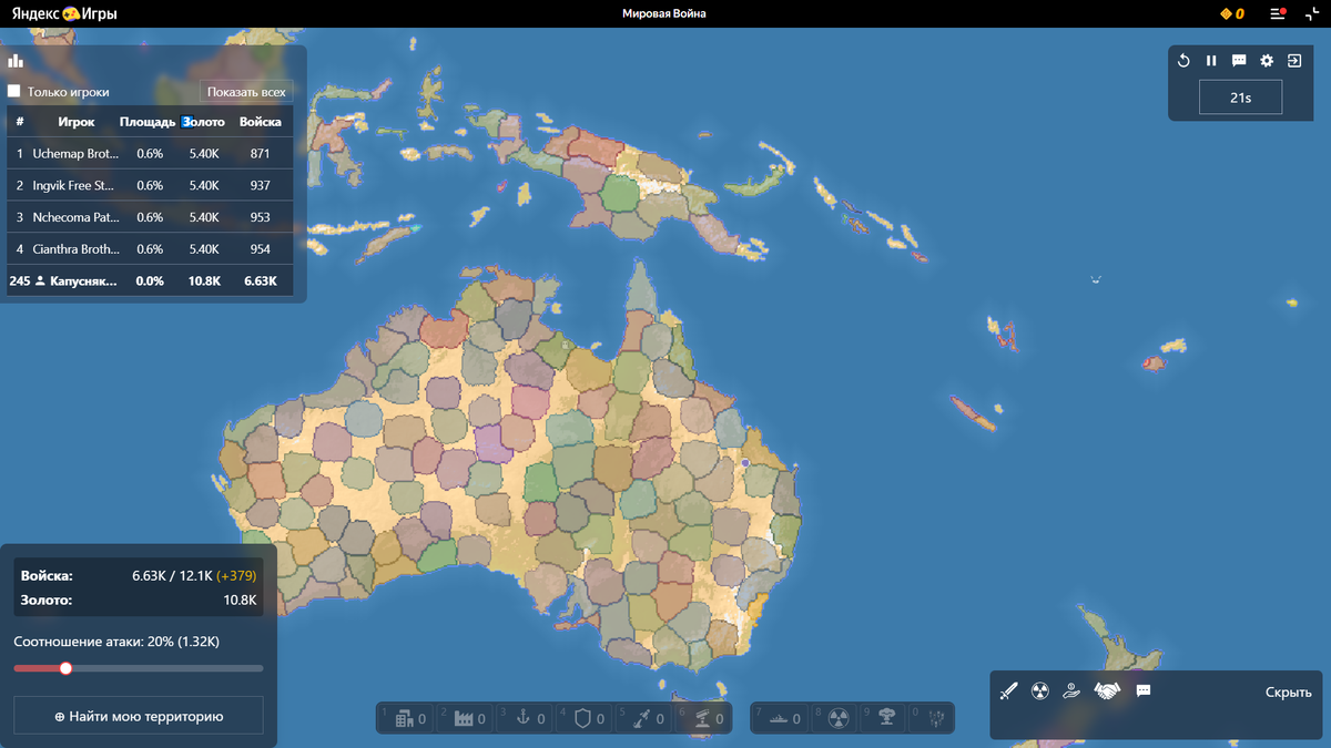 Вам даются очки действий, за одно очко вы можете захватить одну клетку, выиграет тот, кто или окружил базу противника, или, по истечению времени, имеет больше всего территории. Мультиплеер буд-то бы есть, но правда ли там сидят люди - огромная загадка