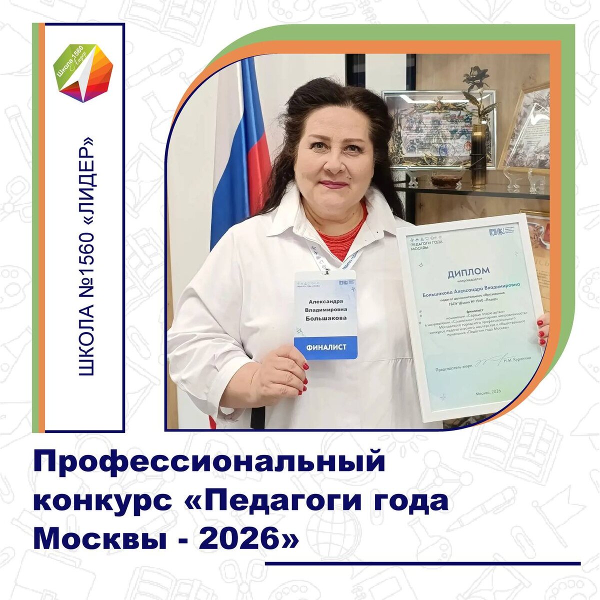 Подведены итоги городского этапа Московского городского профессионального конкурса педагогического мастерства и общественного признания «Педагоги года Москвы» — 2026. В номинации «Сердце отдаю детям» в число финалистов вошла педагог дополнительного образования нашей школы №1560 «Лидер» 🏫📚🎓 Александра Владимировна Большакова. Финальные испытания прошли во Дворце творчества, где участники представляли мастер-классы и демонстрировали свои профессиональные методики. 💬 «Участники были очень сильные, поэтому волнение чувствовалось. При этом атмосфера оставалась доброжелательной: жюри и ребята с интересом относились к каждому выступлению. В коридорах обсуждали показы и делились впечатлениями. Организация была на высоком уровне, поддержка и внимание сопровождали участников на всех этапах», — отметила Александра Владимировна. 🥳 Поздравляем Александру Владимировну с выходом в финал и достойным результатом! Ещё больше полезной информации — в нашем МАХ. #Школа1560Лидер #ДОНМ #КонкурсПро