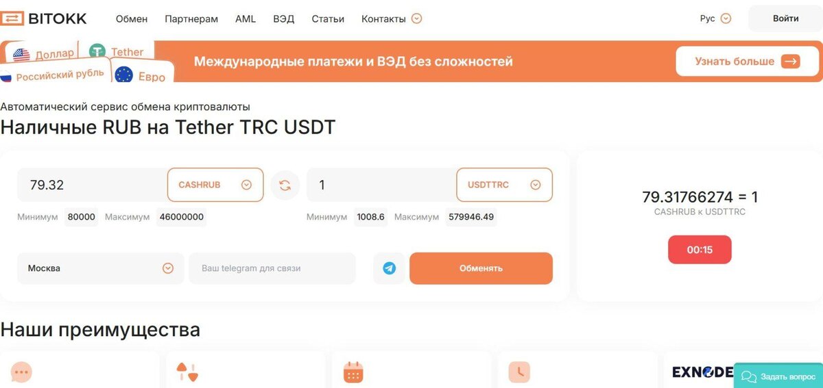 Как-то в пятницу вечером мне срочно надо было вывести USDT в кэш. Биржа зажала лимиты, P2P завис на втором продавце подряд, а деньги были нужны вчера. Полез смотреть обменники. И вот среди них всплыл Bitokk.