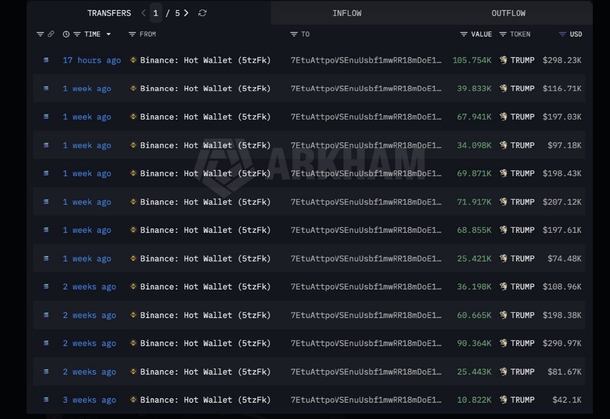 Крупные держатели токенов TRUMP активно накапливают активы перед частным ланчем с Дональдом Трампом 25 апреля. По данным Lookonchain, один кошелек вывел 105 754 TRUMP с Binance, а другой — 850 488 TRUMP с Bybit. Несмотря на спекулятивный рост, цена токена TRUMP упала на более чем 30%, торгуясь около $2.81, что говорит о высокой волатильности и возможности фиксации прибыли инсайдерами. 📊 Ключевые моменты: - 97% общего предложения токенов TRUMP сосредоточено в 100 крупнейших кошельках. - Киты выводят токены с бирж, что может свидетельствовать о подготовке к росту или стремлении получить доступ к эксклюзивным мероприятиям. - Аналитики отмечают, что текущая распродажа розничных инвесторов и действия инсайдеров нивелируют покупательское давление китов.