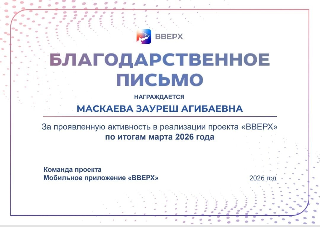 #ЕдинаяРоссия 🏆Получила благодарственное письмо,за проявленную активность в реализации проекта "ВВЕРХ",по итогам марта 2026 года. Благодарственное письмо означает признание моих усилий, вдохновляет продолжать двигаться вперёд и ещё раз убеждает в том , что мои старания были замечены и оценены.