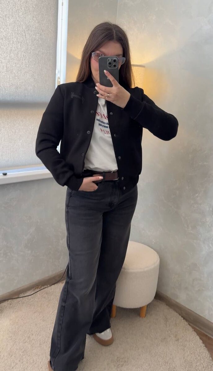 😅 Быстренько показываю, что урвала-бомбер, базовая футболка и идеальные джинсы 🖤 Если честно, образ получился прям на каждый день, надела и пошла, без заморочек. Ссылки: Бомбер [ссылка] Джинсы [ссылка] Кеды [ссылка] Полную видео примерку уже выложила в клипе, переходи смотреть 👀 [смотреть клип]