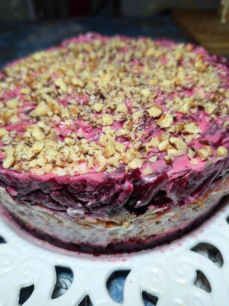 Салат украсьте орехом или укропом, можно и тертым белком.