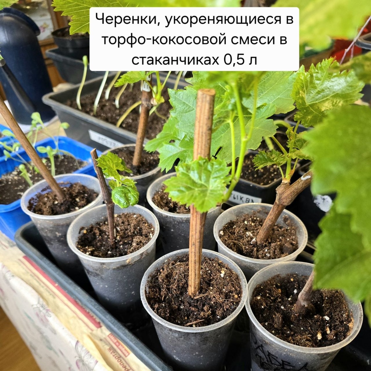 📅Сегодня провели пересадку укоренившихся черенков из стаканов, объёмом 0,5 литра с торфо-кокосовой смесью в горшки с питательным грунтом, объёмом 2 литра. ✅️Данные черенки были поставлены на укоренение вышеуказанным способом 16 марта, т.е. прошёл почти месяц процесса. ✅️За это время на черенках появились корни длиной от 4 до 8 см, а также пробудились почки, из которых появились побеги с листочками. ✅️Посадку в пластиковые горшки проводили методом перевалки, для меньшего травмирования нежных корешков и снижения стресса для самих саженцев. ✅️На дно горшков насыпаем питательный грунт, затем достаём из стакана укоренённый черенок вместе с комом смеси, который помещаем в горшок и засыпаем по бокам грунтом. Затем аккуратно уплотняем грунт и ставим в пластиковый поддон, в который наливаем небольшое количество тёплой воды, для увлажнения грунта снизу. ✅️В дальнейшем полив будем проводить таким же образом, чтобы исключить его переувлажнение. Влажность контролируем прибором для её контроля