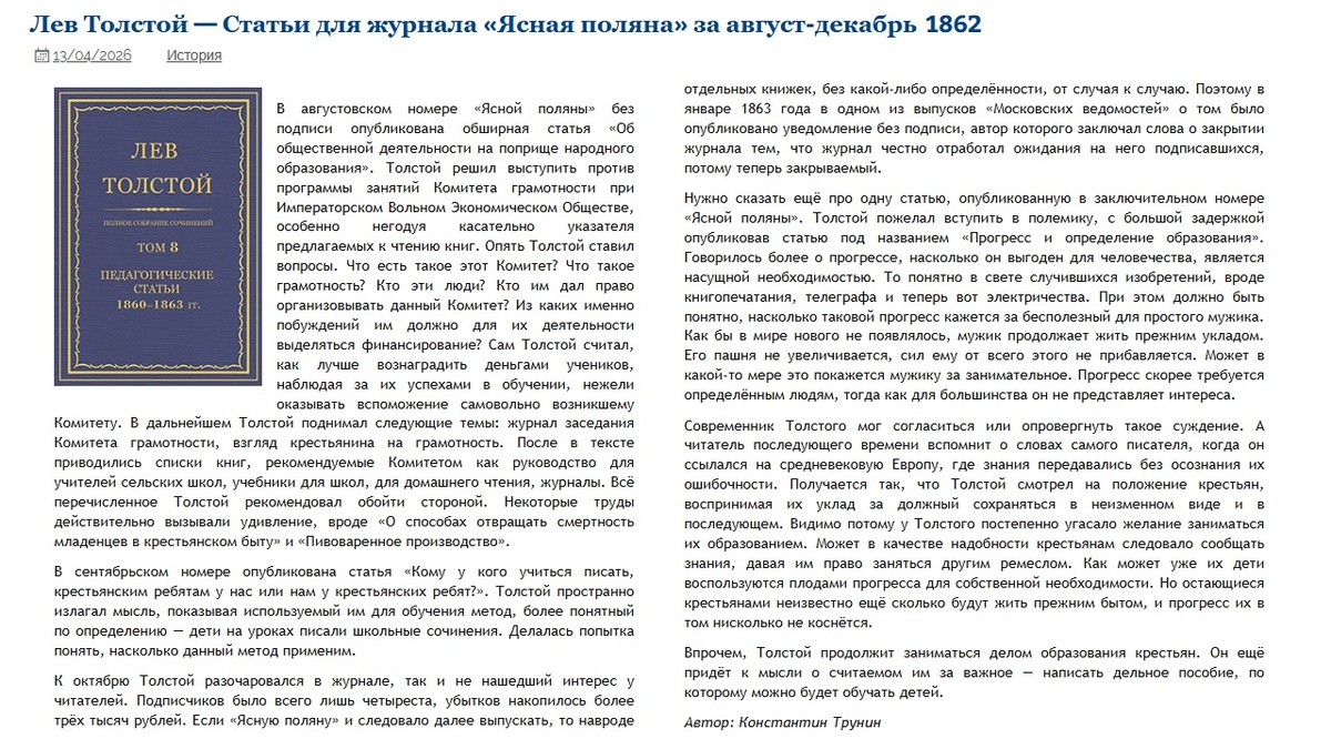 Лев Толстой — Статьи для журнала «Ясная поляна» за август-декабрь 1862 | Критика