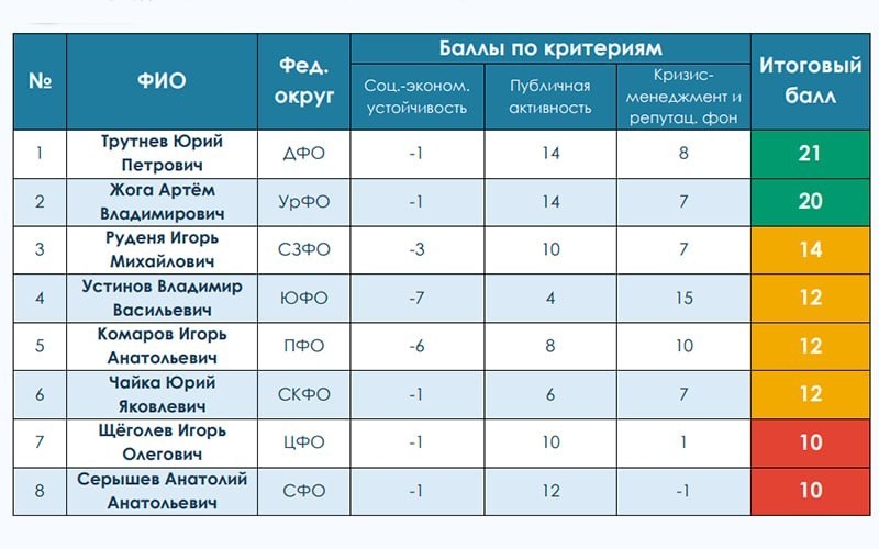 «Центр политической информации» подготовил первый в России рейтинг эффективности полномочных представителей президента Владимира Путина в федеральных округах. Эксперты оценивали «социально-экономическую устойчивость» территорий, публичную активность чиновников и их «кризис-менеджмент и репутационный фон». Последний блок посвящён «реакции полпредов на внештатные и негативные события в курируемых ими федеральных округах, а также публичной критике их деятельности», пояснили авторы исследования. Больше всего баллов согласно рейтингу «Центра политической информации» у полпреда в Дальневосточном федеральном округе, вице-премьера РФ Юрия Трутнева Он, как отмечается в исследовании, «акцентирует внимание на решении широкого спектра вопросов регионального развития — от реализации крупных инвестиционных проектов и мер поддержки граждан (в том числе участников СВО) до ликвидации последствий природных катаклизмов и техногенных катастроф». Второй — уральский полпред Артём Жога, третий — представи