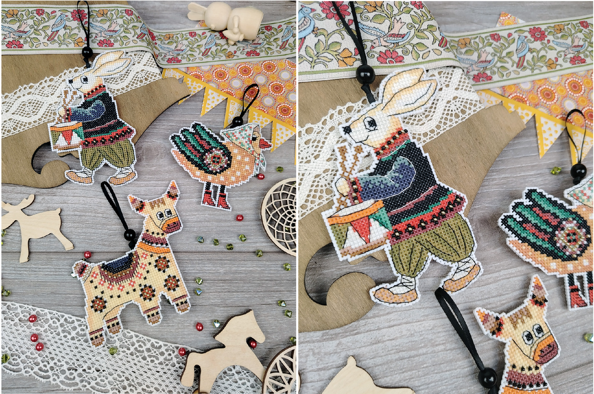 Творческая свобода в прикладное оформлении позволяет сочетать крестики с красивым хлопком, кружевом или лентами. Это превращает работу в полноценный арт-объект, где вышивка - лишь центральный элемент композиции. Праздничный декор - это еще одна сторона прикладного оформления: ёлочные игрушки на пластиковой канве, сапожки для подарков, пасхальные салфетки и другое.