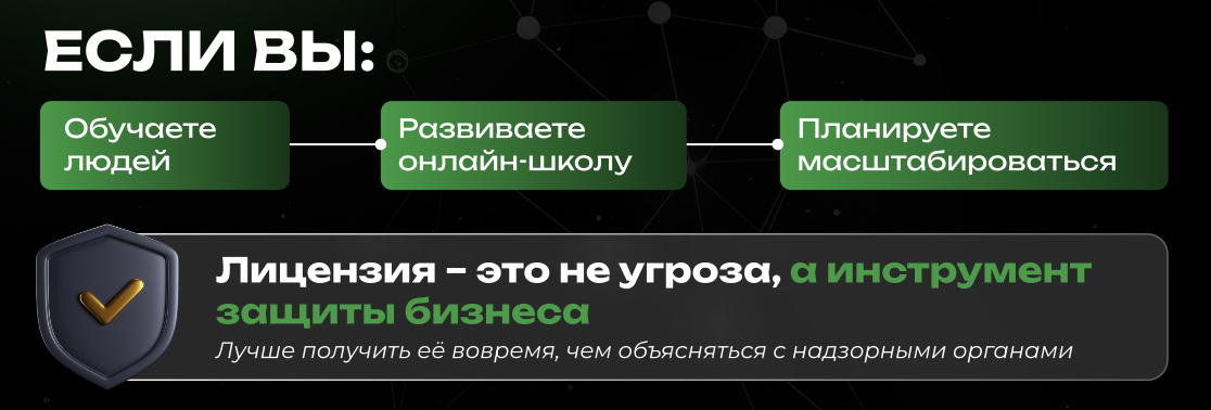Все, что необходимо и ВАЖНО знать о лицензировании каждому эксперту, предпринимателю и онлайн-школе. Самый актуальный вопрос этого года для всех онлайн-школ и экспертов: «А нужна ли лицензия? Или можно работать без неё?» Если Вы проводите обучения или только планируете свои запуски, тема лицензии рано или поздно становится ключевой. Но на практике происходит путаница: одни оформляют лицензию «на всякий случай», другие — наоборот, работает без нее, хотя уже обязаны (и таких экспертов большинство). Как итог - риски штрафов, блокировка деятельности и невозможность масштабирования. Давайте разберемся спокойно и системно, чтобы снять лишнее напряжение, кому и когда нужна лицензия: ⚠️ Лицензия чаще всего НЕ нужна: Но если Вы: - есть высокая вероятность, что Вы осуществляете образовательную деятельность, а значит лицензия - это гарантия Вашей безопасности. Самое главное, что нужно понять: лицензия - это не сложно. В первую очередь, это гарантия вашей безопасности и возможность расти без огра