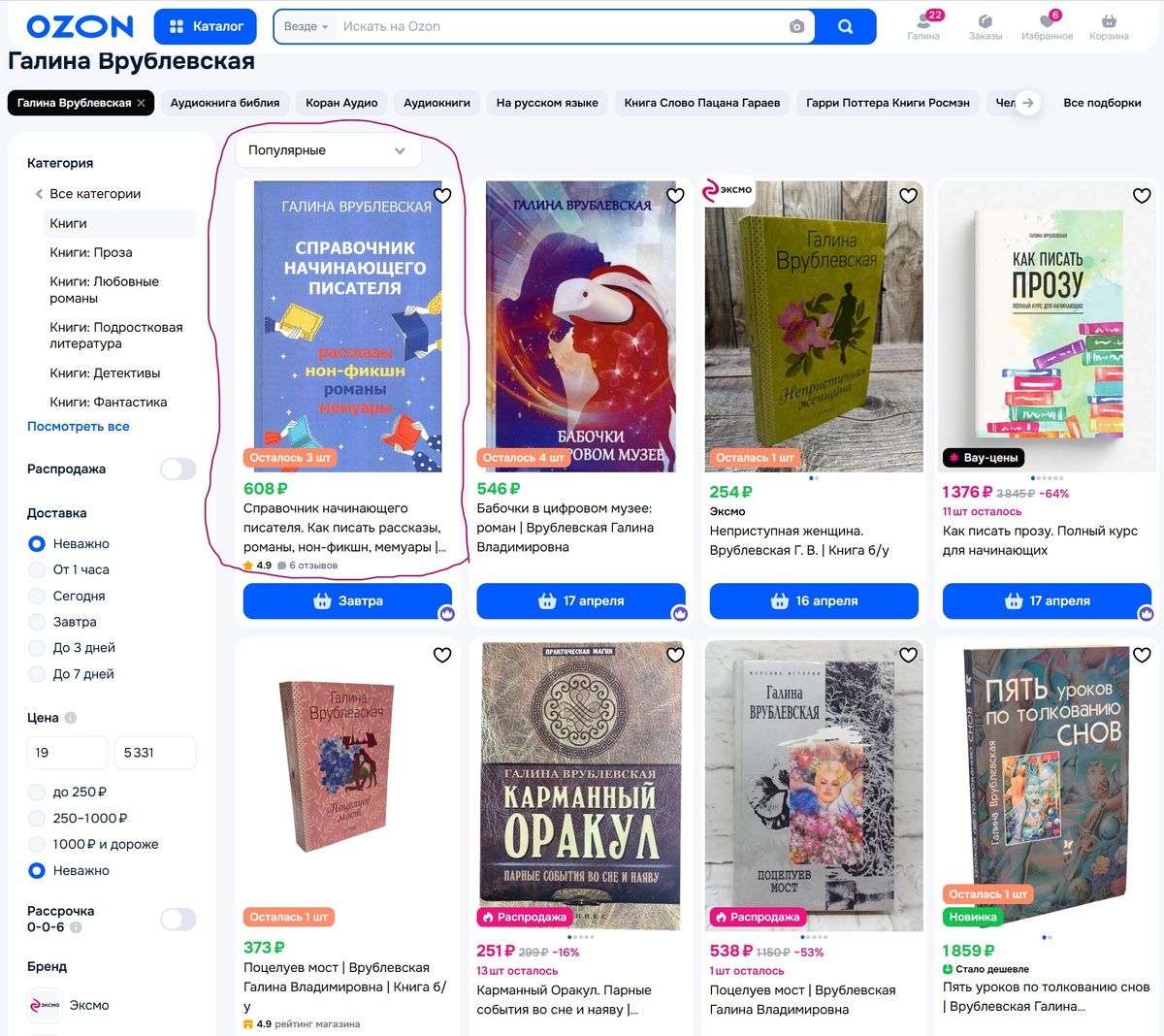 Полгода назад в шаговой доступности от меня открылся очередной пункт выдачи заказов на Озоне, и я начала покупать, покупать, покупать! Разумеется, не только книги, но недавно и на книги решила потратиться. Свои книги я докупаю для подарков приятным людям - дарю их при личных встречах, - поскольку былые авторские экземпляры (от 3-до 10 книг) разошлись. После того, как закончится договор с Издательством, у книги начинается самостоятельная жизнь. Вначале выпустившие их издательства продают какие-то оставшиеся экземпляры, перестав выплачивать за них автору гонорар – продают в бумажных магазинах (это как-то в договоре оговаривается). Жизнь их в таком режиме продолжается долго, но не бесконечно! Но однажды книги попадают на электронные сетевые платформы, и тут приобретают вечную жизнь. Одни книги меняют издателя и, видимо, издаются контрафактом (под брендом первого издателя); другие приобретают статус букинистического издания и резко взлетает в цене. Могут продаваться книги и на Авито, и