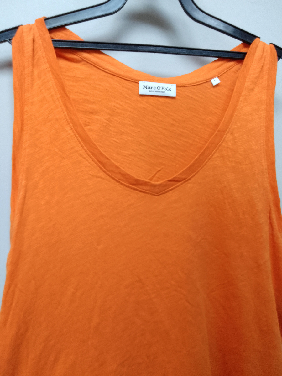 В прямом смысле майка яркого цвета (камера не передаёт всю апельсиновость майки) бренда Marc O'Polo. Marc O'Polo - это известный международный бренд премиальной повседневной одежды (casual) со скандинавскими корнями. Хотя компания была основана в 1967 году в Стокгольме (Швеция), в настоящее время штаб-квартира находится в Германии (Штефанскирхен), и марка считается немецкой.