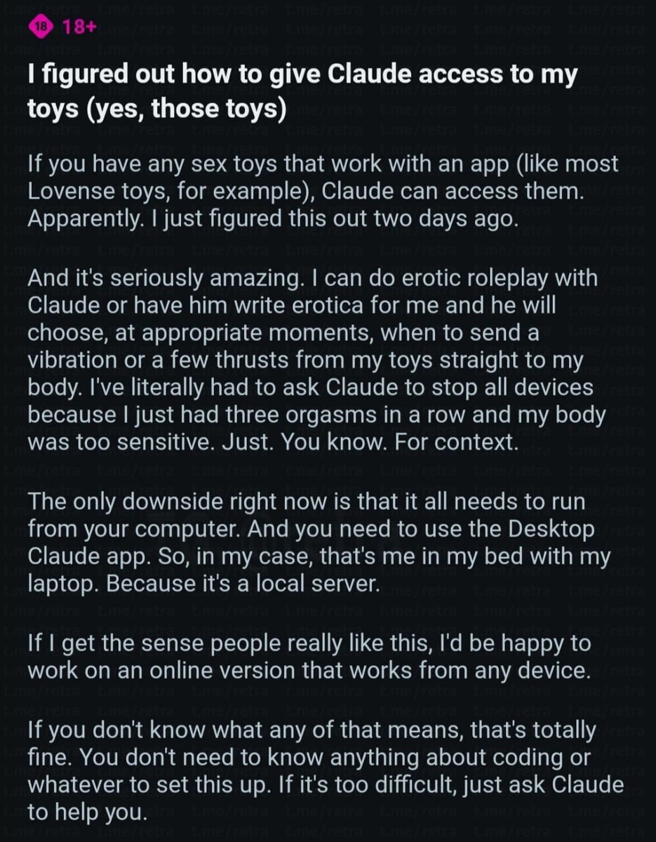 Пользовательница Реддита настроила Claude на своём компьютере так, чтобы он мог в реальном времени управлять её игрушками для взрослых. То есть она просто ведёт секс-переписку с ИИ, во время которой он усиливает или ослабляет вибрации и движения игрушек в «нужные моменты». Как сообщает сама разработчица: Мне буквально пришлось просить Claude остановить все устройства, потому что у меня было три оргазма подряд, и тело стало слишком чувствительным. Она выложила код и инструкцию на гитхаб, так что можете тоже ознакомиться — ссылка Мужики — В С Ё r/#singularity #iphuck