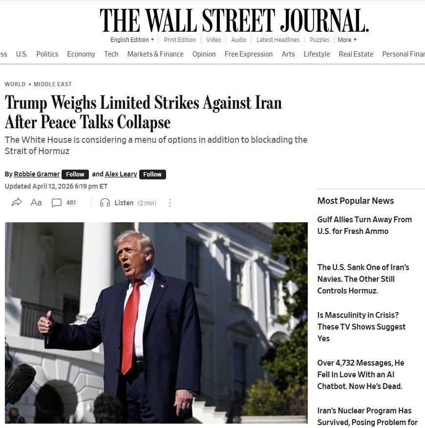 ⏺Президент США Дональд Трамп изучает возможность ограниченных военных ударов по Ирану в дополнение к уже объявленной блокаде Ормузского пролива. Об этом сообщили источники издания The Wall Street Journal. ⏺Это один из сценариев, которые обсуждаются в Белом доме после того, как переговоры США и Ирана в Исламабаде 11 апреля завершились безрезультатно (переговоры длились более 20 часов, но соглашения достичь не удалось). ⏺Другой вариант — возобновление полномасштабной бомбардировочной кампании. Однако, по словам источников, этот сценарий менее вероятен из-за высокого риска дальнейшей дестабилизации Ближнего Востока и нежелания Трампа затягивать военный конфликт. ⏺США также планируют давить на союзников, чтобы те взяли на себя обеспечение безопасности судоходства в регионе. При этом в Белом доме подчёркивают: Трамп по-прежнему привержен дипломатическому решению, но «рассматривает все дополнительные возможности» для давления на Тегеран. ⏺Блокада Ормузского пролива должна начаться уже в