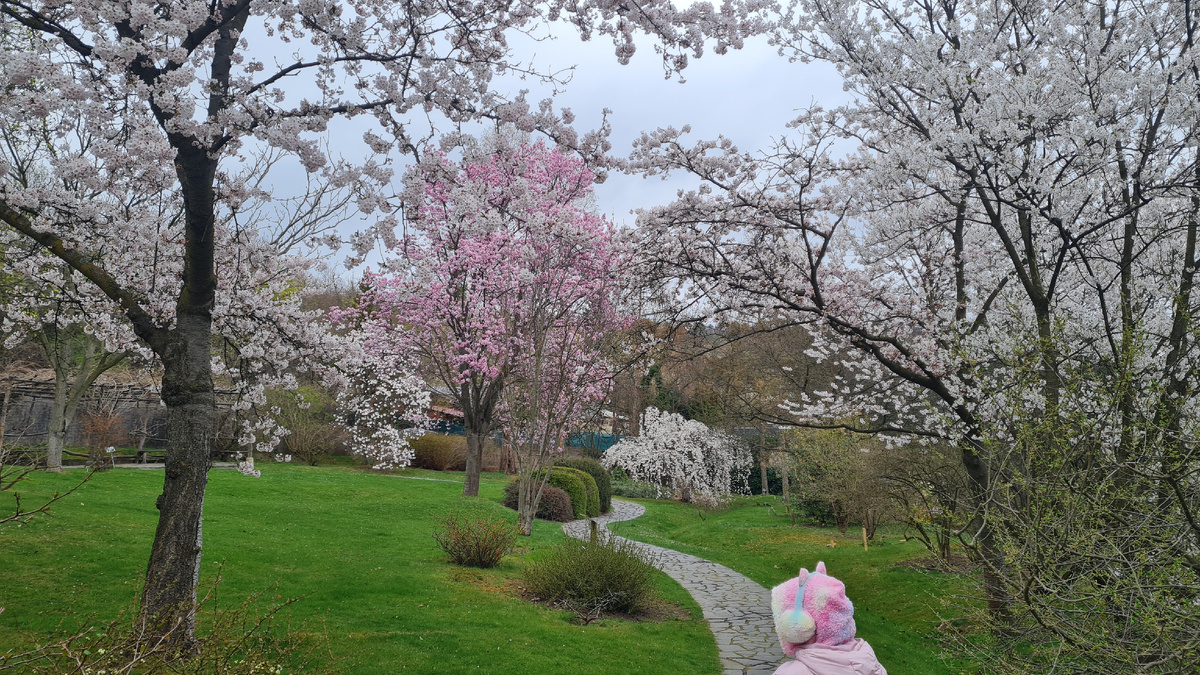 На следующее утро мы оставили Валентина отсыпаться и отправились погулять в ботанический сад, благо он была в пешеходной доступности от нашего кемпинга, и Саша соблазнилась рекламой выставки тропических бабочек. Пешком было не так уже близко, надо было поехать на велосипедах. Но с парковкой велосипедов у них беда. Мы еле свой самокат пристроили у ботанического сада, кассир его спрятала к себе. Конечно, в начале апреля большая часть растений только просыпается и мы видели сад не в самом выигрышном виде. Ландшафт совсем не плоский, идешь долго вверх через виноградники: Оттуда открывается вид на еще один сад, который при дворце напротив. Наверху было прикольное дерево, где можно было понюхать разные сорта виноградного вина. Потом мы пришли в японский сад: Вот такой милый прудик: Зашли в первую часть музея бабочек, там были прикольные макеты, увеличенные глаза, крылья, лапы. Потом нагулявшись по саду мы дошли наконец до второй части музея. Это крытый павильон с тропической растител