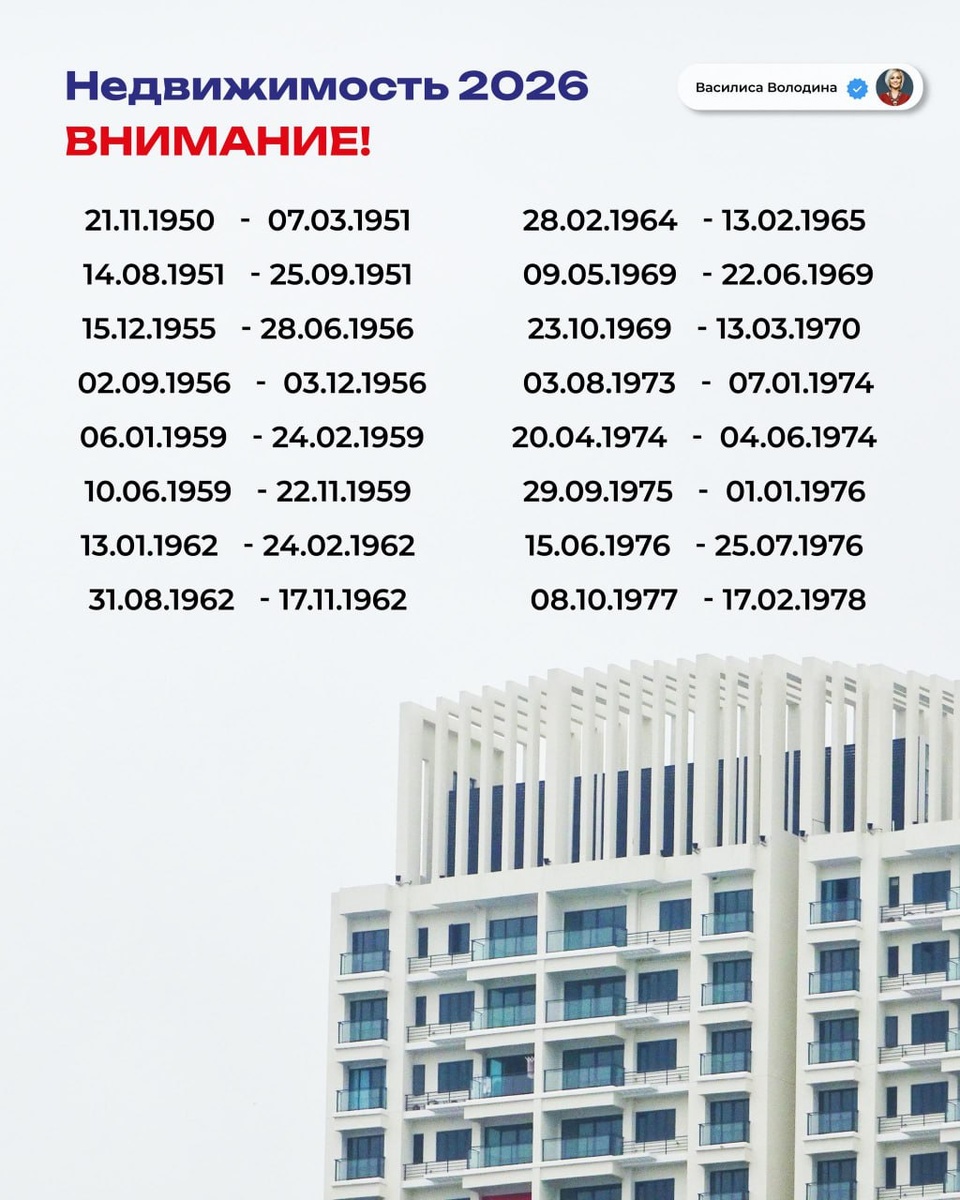 🏠 Так сошлись звезды в 2026-м году, что люди в списках должны быть крайне осторожны с темой недвижимости. Высшие планеты напряженным аспектом задевают Сатурн в их натальных картах. И от этого могут происходить - затягивание сделок и многократные переносы - проблемы с арендой или арендаторами - сложности оформлением прав собственности или госрегистрацией - откровенно мошеннические ситуации и "бабкины схемы" (Долину пока так и не выселили). У каждого свои, но сложности. Надо сказать, что любая сделка с недвижимостью это всегда сложно и небыстро - большие суммы, критические риски. Но если Ваша дата рождения в списках, активничать с домом-квартирой-ипотекой в 2026 году нужно, подключая "второе мнение" - другие астрологические методы, чтобы оценить - это "сложная сделка предстоит" или "лучше вообще не лезть в это". "Подключить" другие астро-методы Вы можете или на личной консультации, или гораздо быстрее и дешевле с личным прогнозом "Знаки судьбы 2026", где тема недвижимости описана