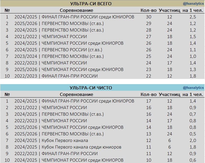 Учтены только исполнения в рамкам Коротких и Произвольных программ. Никакие ЧРПП и Элементы в спецпрограммах в зачет не шли, естественно. Абсолютным лидером обоих списков стал юниорский Финал Гран-при России 2025 прошлого сезона. Причем, заметьте, что участниц там было всего 12. На что еще стоит обратить внимание: 1. нет ни одного международного турнира. Полное доминирование российских турниров (и соответственно, наших девушек) в этом аспекте.