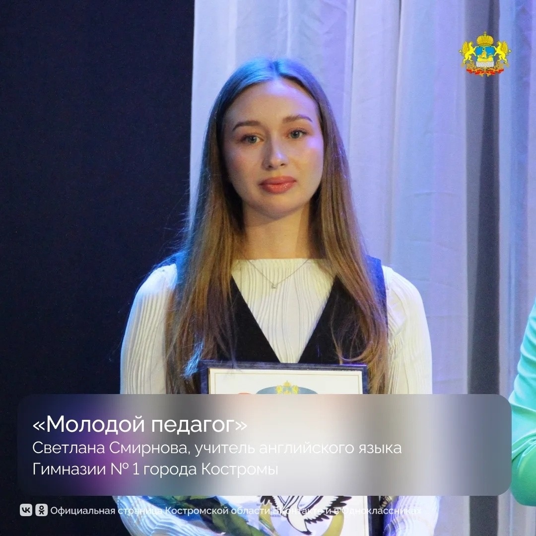Выпускница кафедры романо-германских языков Светлана Смирнова стала победителем областного этапа конкурса «Учитель года — 2026» в номинации «Молодой педагог». Церемония награждения состоялась во Дворце творчества в Костроме. Лучших педагогов определили более 100 экспертов в 5 конкурсных испытаниях, среди которых: «Медиавизитка» — демонстрация наиболее значимых аспектов профессиональной деятельности и педагогической индивидуальности; «Моя педагогическая находка» — представление успешного элемента воспитательной работы; «Учебное занятие» — оценка профессиональных компетенций при проведении учебного занятия; «Педагогическая мастерская» — презентация и трансляция педагогического опыта в ситуации профессионального взаимодействия; «Профессиональный разговор» — демонстрация способности лауреатов конкурса к конструктивному диалогу по актуальным вопросам развития образования.