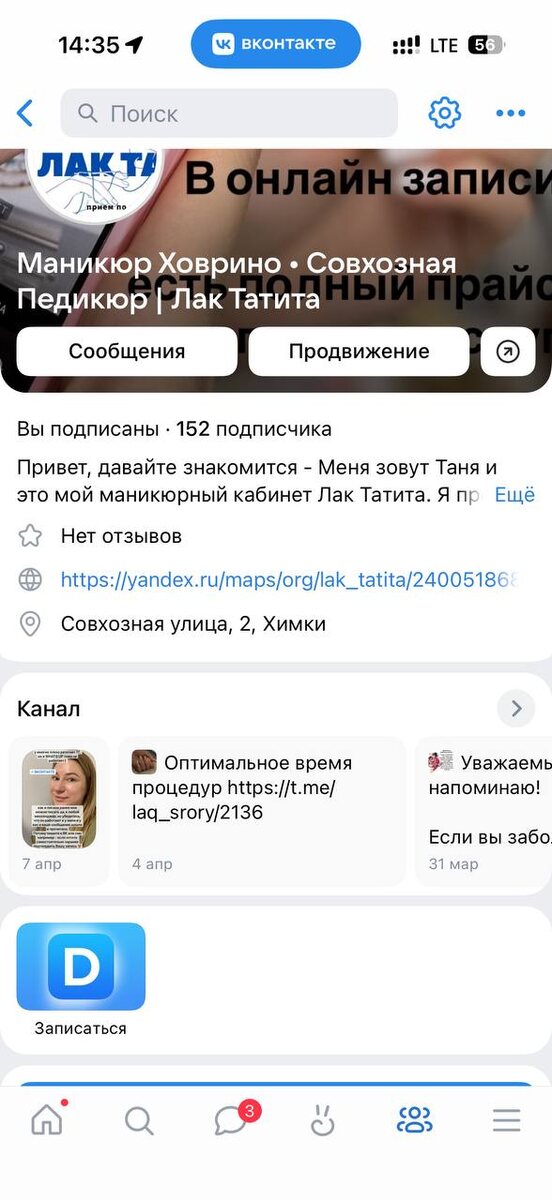 https://vk.ru/laq_tatita Уважаемые клиенты, для оперативной связи как я и говорила - я всегда доступна ВКонтакте. Это очень удобно , вы можете мне сразу и сообщение написать и записаться по кнопке «записаться». Для этого вам не нужно постоянно включать и выключать VPN чтобы у вас работал мессенджер. ‼️Также напоминаю при включённом VPN онлайн запись DIKIDI может работать некорректно