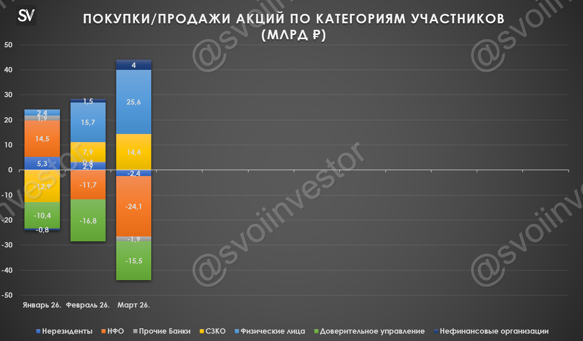Давайте взглянем на интересности из отчёта: 🏛 Акции: 💬 По итогам марта IMOEX снизился на 0,6%, составив 2776 пункта (геополитика). Среднедневной объём торгов акциями в марте увеличился до 119₽ млрд (в феврале — 89,9₽ млрд). 💬 Основными покупателями на российском рынке акций в марте стали, вновь, физические лица — 25,6₽ млрд (вера розничных инвесторов непоколебима, в феврале — 15,7₽ млрд). Основными продавцами на российском рынке акций в марте стали НФО — 24,1₽ млрд (в феврале продали на 11,7₽ млрд). Обратите внимание, что сначала года НФО ДУ разгружаются по полной (-42,7₽ млрд, самые большие продажи из всех категорий участников), через доверительное управление могут выходить нерезиденты, то есть зная, что такая функция есть сами НФО тоже могут лить акции (может это фантазии автора, но чёрт возьми, как это всё похоже на...). 💬 Нерезиденты из дружественных стран продали акции в марте на 2,4₽ млрд (в феврале покупали — 2,9₽ млрд). 💵💴 Валюта: 💬 В марте ₽ ослаб к $ до 81,3₽ (+5,2% м/