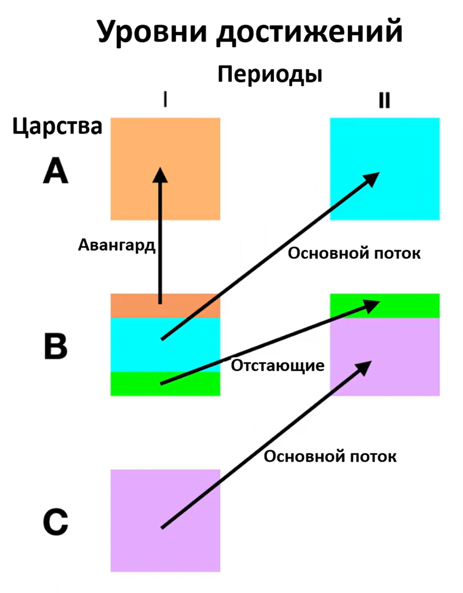 Если вы посмотрите на эту диаграмму, вы увидите три царства: A, B и C. Также указаны два временных периода I и II. В царстве B, в периоде I, крошечное меньшинство, авангард, опережает остальных, достигая поставленной цели, и переходит в царство A в тот же период. Большая часть царства B, основной поток, переходит в царство A в периоде II обычным образом. Остальная часть царства B, отстающие, превышающее по численности предыдущее меньшинство (лучших учеников) – не проходит отбор в царство A и поэтому продолжает обучение в царстве B в периоде II. Однако они уже получили опыт в царстве B, поэтому входят в период II в числе лучших учеников. Монады в царстве C в периоде I только что вошли в царство B в периоде II, поэтому они отстают от тех монад, которые отставали в периоде I.