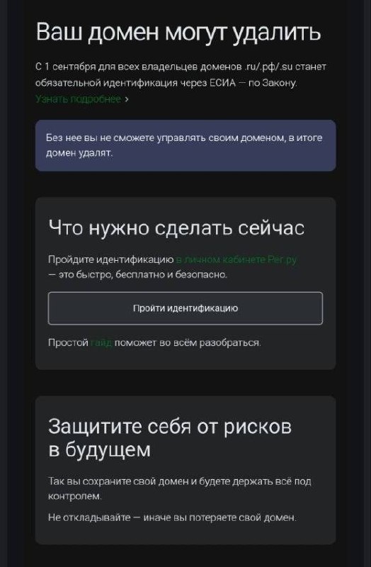 Мне когда-то блокировали уже сайты и было сложно понять причину и найти решение для восстановления. Просто снесли и все - в чем причина, мол догадайся сам. Домен всегда регался на паспорт, просто не всегда опубличивались данные владельца. Что стоит только изучить и придерживаться правилам рекламы, замучаешься маркировать каждое телодвижение и отчитываться. Чет тяжко так работать так-то...не успеваешь изучить одну инфу, как нужно изучать что-то новую, и пытаться всему соответствовать. Когда работать то? Создавать сайты анонимно запретят в России, - СМИ. С 1 сентября домены в зонах «.ru», «.рф» и «.su» можно будет регистрировать только с подтверждением через «Госуслуги». Владельцам ресурсов уже начали рассылать требования пройти идентификацию. 😀 PONYAKIN САЙТ ✈️ ТГ / 📲 MAX / 👤VK