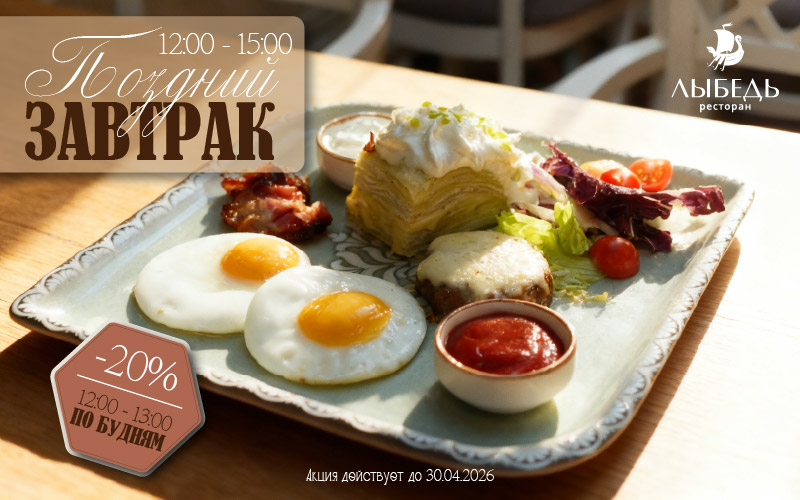 При заказе завтрака по будням с 12:00 до 13:00 действует скидка 20%