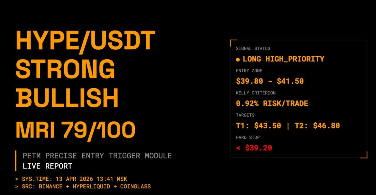 💰 Grok анализ на сегодня по монете HYPE: Режим: Strong Bullish (подтверждено MRI 79, Hurst 0.59, VPIN 0.67, Fractal Validity 78%, CQ NEUTRAL-BULL). Микроструктура: BID dominance +16.7%, GEX +$630M, short-liq magnet $42.5–$43.5. Стратегия: Торговать LONG потому что informed flow (whale +$34M 24h + staking +7.55M) + gamma защита + RWA/stablecoin inflows. Ожидаемая доходность: Sharpe 2.9 при риске ≤1%. Ключевые уровни: Поддержка: $39.80 (Fractal + VAL + STH cost). Сопротивление: $43.50 (short-liq + Max Pain). Стоп-хант зоны: $36–$37.5 (cascade risk 78%). Сценарии: Базовый (68%): Удержание $39.8, рост к $46.8. Триггер: отскок от VAL с объёмом >1.6x. Бычий (22%): ETF catalyst + RWA inflow → $53+. Триггер: Dominance <54% + staking >450M. Медвежий (10%): Глубокий hunt ниже $36. Триггер: ETF delay + funding spike >0.02%. Риск-менеджмент: Плечо максимум: ≤3x (снижать до 2x при Validity <70%). Риск на сделку: ≤1.0% портфеля (Kelly 0.85–0.92%). Трейлинг стоп: ATR × 2 или ниже $39