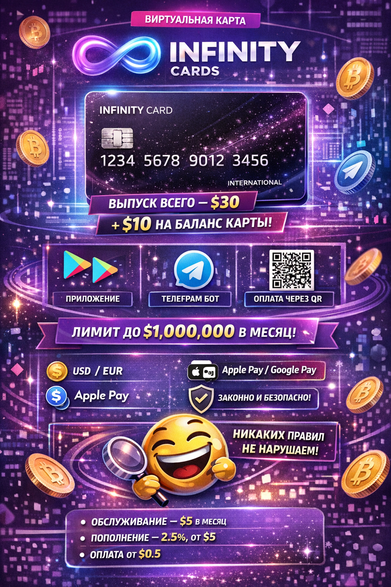 Готовы к удобным и законным платежам? Оформите Infinity Cards прямо сейчас по этой ссылке и получите $10 на баланс уже при выпуске — https://taplink.cc/rekbestv/d/5f08/.