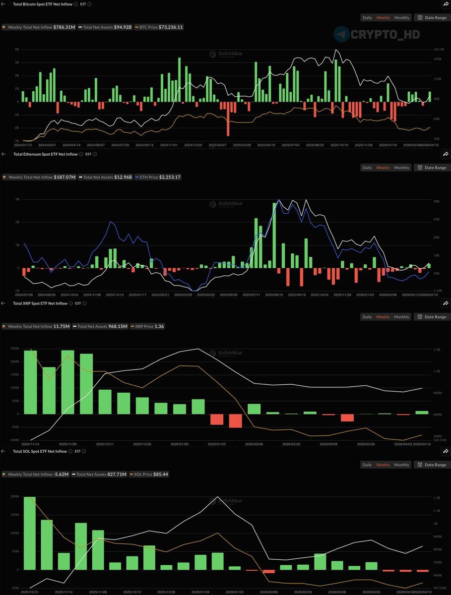 ⊹ Bitcoin ETF (#BTC) = +$786,310,000. ⊹ Ethereum ETF (#ETH) = +$187,070,000. ⊹ Ripple ETF (#XRP) = +11,750,000. ⊹ Solana ETF (#SOL) = -$5,620,000. ⊹ Chainlink ETF (#LINK) = +$1,290,000. ⊹ Dogecoin ETF (#DOGE) = +$1,340,000. ⊹ Hedera ETF (#HBAR) = +$594,980. ⊹ Litecoin ETF (#LTC) = -$404,700. ⊹ Polkadot (#DOT) = $784,960. ⊹ Avalanche (#AVAX) = $0 (или нет данных). Crypto Headlines