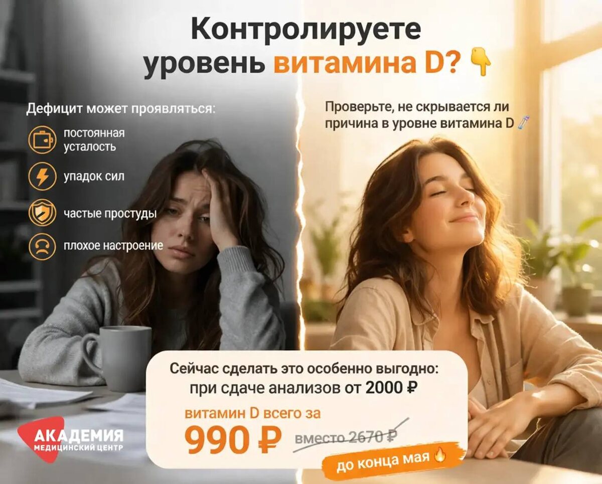 ?👇 Витамин D — это не просто «про солнце». Он влияет на иммунитет, энергию, настроение, состояние кожи и даже на уровень усталости. Если чувствуете: — постоянную усталость — упадок сил — частые простуды — плохое настроение Проверьте, не скрывается ли причина в уровне витамина D 🧪 Сейчас сделать это можно особенно выгодно: при сдаче анализов от 2000 ₽ — витамин D всего за 990 ₽ вместо 2670 ₽ до конца мая🔥 Запись в клинику через👇 — телефон 📞 +7 8422 27-05-05 — сайт 🌐 academy-med.ru — телеграм 🌐 @Academychat73 💠 НАШ КАНАЛ В MAX