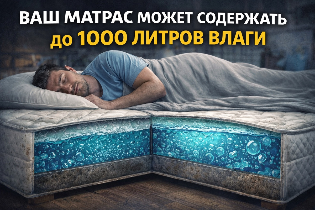 Каждую ночь человек спит 6–8 часов. И пока вы отдыхаете, тело продолжает работать. В том числе — выделять влагу и большая часть этой влаги… остаётся в матрасе. ⸻ 💧 Сколько пота выделяет человек Во время сна человек в среднем выделяет: 👉 от 200 до 500 мл влаги за ночь Это может быть: • пот • испарения с кожи • дыхание Теперь посчитаем. ⸻ 📊 За год Возьмём среднее значение — 300 мл за ночь. 👉 300 мл × 365 дней = около 110 литров в год Да, больше 100 литров. ⸻ 😶 А теперь за 10 лет 👉 110 литров × 10 лет = 1100 литров влаги Это больше, чем: • ванна • или почти тонна воды И значительная часть этой влаги впитывается в матрас. Да, наибольшая часть пота высыхает, но уходит только чистая влага, а соли и шлаки оседают. ⸻ 🤢 Что происходит внутри матраса? Матрас — это не просто ткань. Это: • слои наполнителя • пористая структура • идеальная среда для накопления влаги А где есть влага — там появляется: • пыль • бактерии • микроскопические клещи И всё это накапливается годами. ⸻ 🧠 Почему это