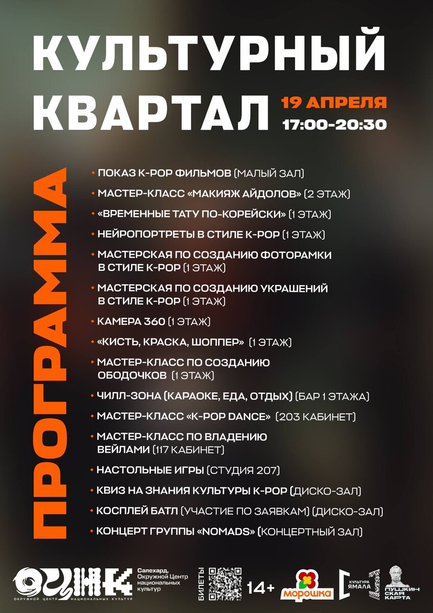 ! Рады сообщить, что с сегодняшнего дня открыта продажа единого билета на акцию «Культурный квартал» для всех! Билет можно приобрести по ссылке: clck.ru/3SxTce, по Пушкинской карте или через сервис «Морошка» со скидкой 20% Также подкрепляем для вас программу мероприятия 💫 Мастер-классы, творческие локации и «Косплей батл» будут проходить с 17:00 до 19:00 Выступление хедлайнера - группы «NOMADS» состоится в 19:00 в концертном зале. Ну и, конечно, не забывайте про розыгрыш айфона (среди купивших билет по Пушкинской карте)📱 До встречи в Окружном Центре национальных культур!