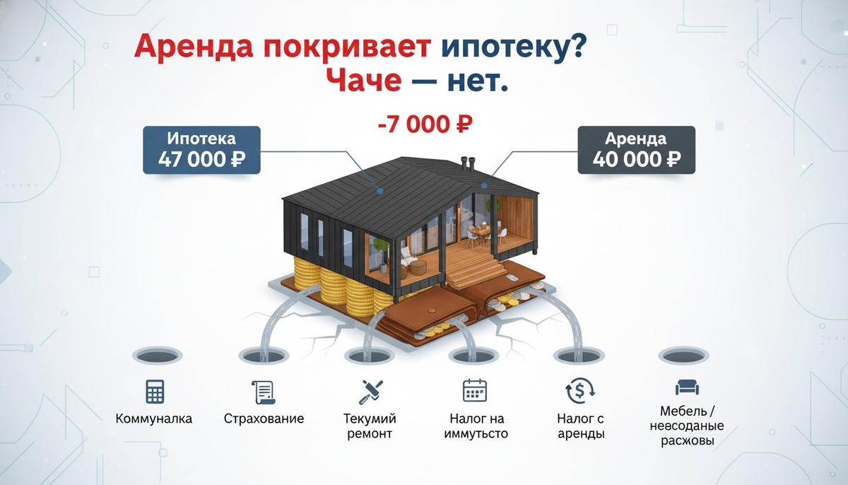 📉 Самая частая ошибка инвесторов — считать только «ипотека минус аренда». Мы в Box House считаем полный цикл: платёж по кредиту, коммуналка, страхование, текущий ремонт, налог на имущество и налог с дохода от аренды. Пример: квартира 7 млн (взнос 1,4 млн), кредит 5,6 млн @8% на 20 лет — платёж ≈47 000 ₽; аренда ≈40 000 ₽. Уже −7 000 ₽ до коммуналки (≈4 000 ₽), налогов и ремонта. Скрытые расходы (мебель, ремонты) легко добавляют ещё 10–15 тыс/мес. Вывод: без учёта жизненного цикла ипотека превращается в постоянную доплату. Хотите, посчитаем ваш объект? 🏠💬