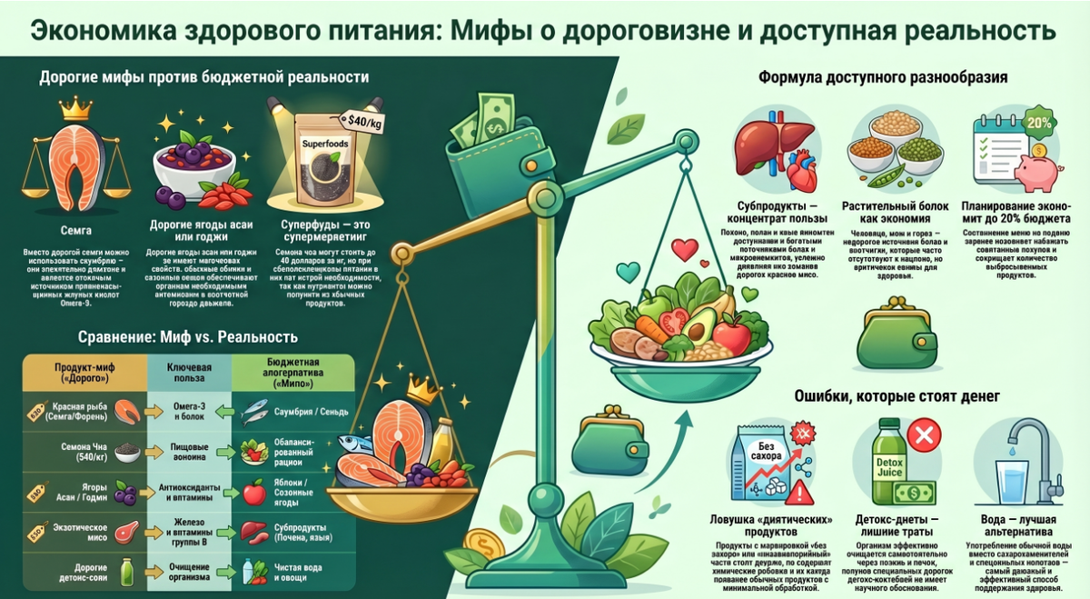 Здоровое питание (ЗП) обросло таким количеством легенд, что за ними не видно самой тарелки. Пора сорвать покровы и разобраться, где нас кормят наукой, а где — маркетинговой лапшой. Разбираем всё по полочкам! Миф: Правильное питание — это только для богачей. Нужны семена чиа, ягоды асаи и обязательно красная рыба., Реальность: Здоровый рацион может быть бюджетным. Вместо семги — скумбрия (в ней полно омега-3), вместо экзотических ягод — сезонные овощи и яблоки., Помните: семена чиа стоят до 40 долларов за кг, но если ваше питание сбалансировано, в них нет острой необходимости. ЗОЖ — это не про деликатесы, а про разнообразие: не забывайте про птицу, субпродукты (печень, язык) и растительный белок (чечевица, маш, горох). Миф: Нельзя есть после 18:00, а питаться нужно 6 раз в день, чтобы «разогнать» метаболизм., Реальность: Организму важен общий суточный баланс калорий, а не время их поступления.,, Метаболизм не «выключается» в 18:00. Ужинать можно за 2–3 часа до сна. Что касается частоты: