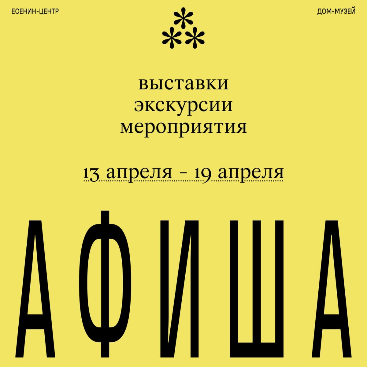 🍂🍂🍂🍂🍂 События в музее Есенина на неделю ☘️ВЫСТАВКИ : Есенин-центр (переулок Чернышевского, 4, стр. 2): 13-19 апреля. Выставка "Черный человек. Исповедь поэта". 13-19 апреля. Выставка "Поезд № 143". 13-19 апреля. Выставка "Фронтовик Константин Есенин". Дом-музей С.А. Есенина (Большой Строченовский переулок, 24, стр. 2): 13-19 апреля. Постоянная литературно-мемориальная экспозиция и выставка «Это все, что зовем мы Родиной…» 🌱МЕРОПРИЯТИЯ: Есенин-центр (переулок Чернышевского, 4, стр. 2): 15 апреля в 19:30. Мастер-класс «Черный человек в мире супрематизма». По предварительной записи: +79296167182 (Вероника). 17 апреля в 19:00. Концерт "На грани техники и поэзии". 18 апреля в 18:00. Мастер-класс «Черный человек в мире супрематизма». По предварительной записи: +79296167182 (Вероника). 18 апреля в 19:30. Концерт "С чистого листа". ⭐️ЭКСКУРСИИ: Есенин-центр (переулок Чернышевского, 4, стр. 2): 15 апреля в 18:30. "Я один… И разбитое зеркало". Специальная экскурсионная программа к