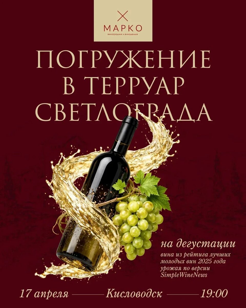 Приглашаю и рекомендую 🍷 Погружение в терруар Светлограда Во время обучения на курсе "Маркетинг вина через еду" мы продегустировали вина молодой, но очень красиво развивающейся Ставропольской винодельни "Марко". И решили, что пора познакомить Вас с этими прекрасными винами из Светлограда. 17 апреля винодельня Марко и двигатель её Павел Грабовский представит нам вина: 1. Игристое по классическому методу Мари' 2024 года урожая, 100% шардоне, зеро дозаж, 12 месяцев на осадке 2. Петнат Розе 2025 (сорт Мерло) 3. Петнат Блан 2025 (сорта Рислинг и Ркацители) 4. Рислинг 2025, белое сухое 5. Ркацители 2025, белое сухое 6. Саперави 2025, красное сухое 7. Каберне Фран 2024 красное сухое 8. Каберне Фран 2023 красное сухое, выдержка французский дуб 12 месяцев 9. Ассамбляж 2023 красное сухое, выдержка французский дуб 12 месяцев Будет здорово. 18+ И мы проведем 2 встречи. Первая встреча дневная: 📍 Где: Железноводск, улица Ленина, 25. Магазин- бар Дегустатор 🕒 Когда: 15:00 17 апреля 2026 Вторая вс