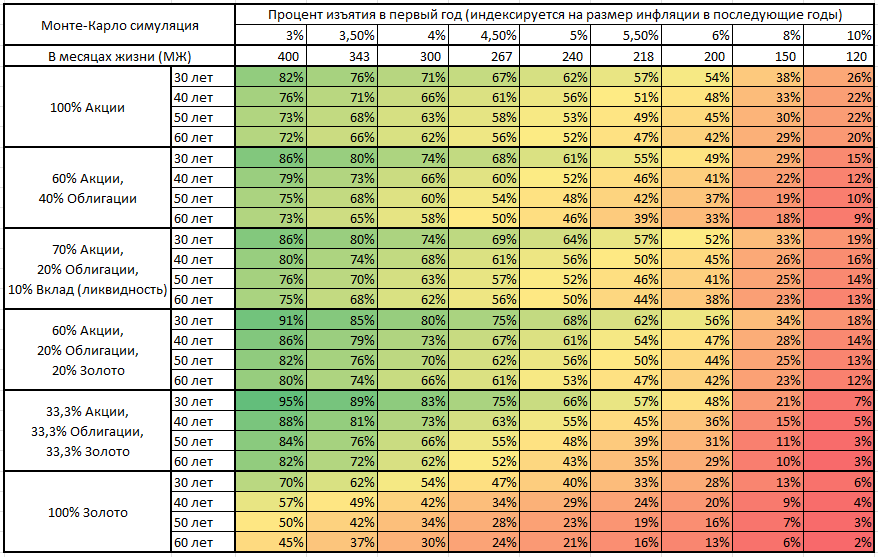 Я сделал сначала одну модель, которая просто переставляет существовавшие значения доходности рынка РФ местами, но вероятность успеха мне показалась завышенной. Так например, я получил 100% вероятность успеха продержаться 60 лет, изымая 4%+индексацию из портфеля, целиком состоящего из золота. Поэтому пришлось сделать другую: Монте-Карло с логнормальным распределением рассчитывает вероятность того, что портфель продержится 30, 40, 50 и 60 лет при ставке изъятия от 3% до 10%. И всё это делается для каждого из портфелей: 100% Акции, 60/40, 80/20/20, 33/33/33, 70/20/10 и 100% Золота. Вот результат расчета: У каждого портфеля своё среднее арифметическое значение доходности и своё стандартное отклонение. Всего вышло 216 сценариев по 10 тысяч симуляций в каждом, итого 2,16 млн "прогонов" модельки. Результат - в табличке. ▪️ Вероятность успеха на горизонте 60 лет для моего портфеля (70/20/10, 4%) - всего 62%. Это невысокая вероятность, я бы чувствовал себя спокойнее при 80%+. ▪️ Слабые результ
