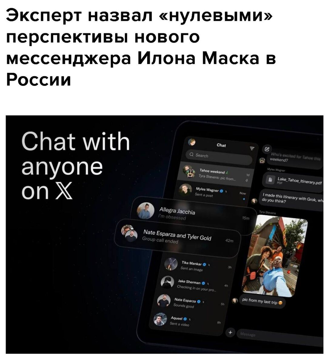 17 Π°ΠΏΡΠ΅Π»Ρ 2026 Π³ΠΎΠ΄Π° ΠΊΠΎΠΌΠΏΠ°Π½ΠΈΡ X (ΠΏΡΠΈΠ½Π°Π΄Π»Π΅ΠΆΠΈΡ ΠΠ»ΠΎΠ½Ρ ΠΠ°ΡΠΊΡ) Π·Π°ΠΏΡΡΠΊΠ°Π΅Ρ ΠΎΡΠ΄Π΅Π»ΡΠ½ΠΎΠ΅ ΠΏΡΠΈΠ»ΠΎΠΆΠ΅Π½ΠΈΠ΅ XChat β ΠΏΠΎΠ»Π½ΠΎΡΠ΅Π½Π½ΡΠΉ ΠΌΠ΅ΡΡΠ΅Π½Π΄ΠΆΠ΅Ρ Ρ ΡΠΊΠ²ΠΎΠ·Π½ΡΠΌ ΡΠΈΡΡΠΎΠ²Π°Π½ΠΈΠ΅ΠΌ, Π·Π²ΠΎΠ½ΠΊΠ°ΠΌΠΈ, ΠΈΡΡΠ΅Π·Π°ΡΡΠΈΠΌΠΈ ΡΠΎΠΎΠ±ΡΠ΅Π½ΠΈΡΠΌΠΈ, ΠΎΡΠΏΡΠ°Π²ΠΊΠΎΠΉ ΡΠ°ΠΉΠ»ΠΎΠ² ΠΈ Π±Π΅Π· ΡΠ΅ΠΊΠ»Π°ΠΌΡ ΠΈ ΡΡΠ΅ΠΊΠΈΠ½Π³Π°. ΠΠΎΠΊΠ° ΡΠΎΠ»ΡΠΊΠΎ Π΄Π»Ρ iOS (iPhone ΠΈ iPad), Ρ Π²ΠΎΠ·ΠΌΠΎΠΆΠ½ΠΎΡΡΡΡ ΡΠ°ΡΠΈΡΡ Ρ Π»ΡΠ±ΡΠΌ ΠΏΠΎΠ»ΡΠ·ΠΎΠ²Π°ΡΠ΅Π»Π΅ΠΌ X Π±Π΅Π· ΡΠΊΠ°Π·Π°Π½ΠΈΡ Π½ΠΎΠΌΠ΅ΡΠ° ΡΠ΅Π»Π΅ΡΠΎΠ½Π°. ΠΠ΅Π΄ΡΡΠΈΠΉ Π°Π½Π°Π»ΠΈΡΠΈΠΊ Mobile Research Group ΠΠ»ΡΠ΄Π°Ρ ΠΡΡΡΠ°Π·ΠΈΠ½ ΡΠΆΠ΅ Π΄Π°Π» ΠΆΡΡΡΠΊΠΈΠΉ ΠΏΡΠΎΠ³Π½ΠΎΠ·: Β«ΠΡΠ»ΠΈ ΠΌΠ΅ΡΡΠ΅Π½Π΄ΠΆΠ΅Ρ Π½Π°ΡΠ½ΡΡ Π½Π°Π±ΠΈΡΠ°ΡΡ ΠΏΠΎΠΏΡΠ»ΡΡΠ½ΠΎΡΡΡ Π² Π ΠΎΡΡΠΈΠΈ, Π΅Π³ΠΎ ΡΡΡ ΠΆΠ΅ Π·Π°Π±Π»ΠΎΠΊΠΈΡΡΠ΅Ρ Π ΠΎΡΠΊΠΎΠΌΠ½Π°Π΄Π·ΠΎΡΒ». ΠΠΎ ΠΌΠ½Π΅Π½ΠΈΡ ΡΠΊΡΠΏΠ΅ΡΡΠΎΠ², Ρ XChat ΠΊΡΠ°ΠΉΠ½Π΅ Π½ΠΈΠ·ΠΊΠΈΠ΅ ΡΠ°Π½ΡΡ Π½Π° ΡΡΠΏΠ΅Ρ