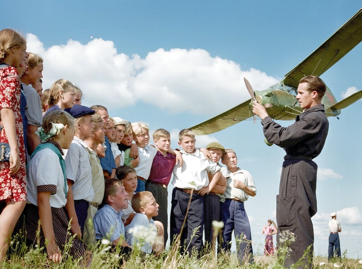 Педагог, авиамоделист Александр Эрлер и дети из спортивного кружка планеризма Фильм: Планеристы. 1951 г