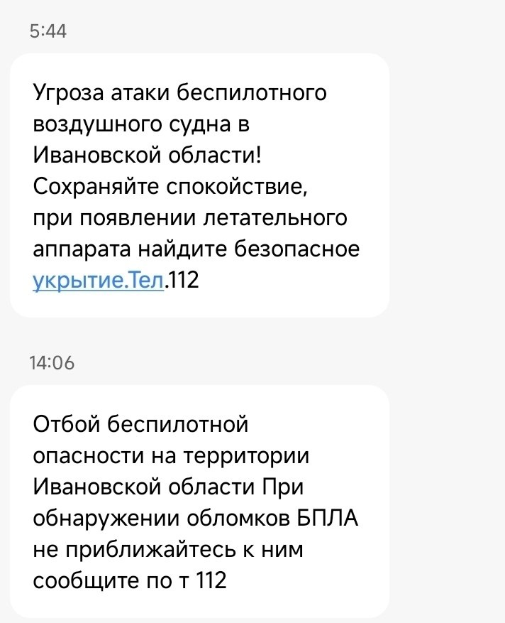 В редакцию IN поступило несколько таких сообщений. Одно — из Палехского района, около 9 часов утра. «Ушли в сторону Родников», - рассказал наш подписчик. Из Родников нам написали о трех беспилотных аппаратах, пролетевших в разных траекториях в направлении Костромской области. По словам жителей, звонивших в 112, трубку там никто не снял. Между тем, в Ивановской области режим угрозы БПЛА действовал с 5.27 до 13.16, в Костромской — с 8.40 до 13.33. О каких-либо происшествиях, связанных с пролетом дронов, официально не сообщалось. В сводке Минобороны о перехваченных и уничтоженных беспилотниках наши области не упоминаются. Напомним, что съемка пролета БПЛА, работы ПВО, последствий атаки и публикация этих кадров запрещена.