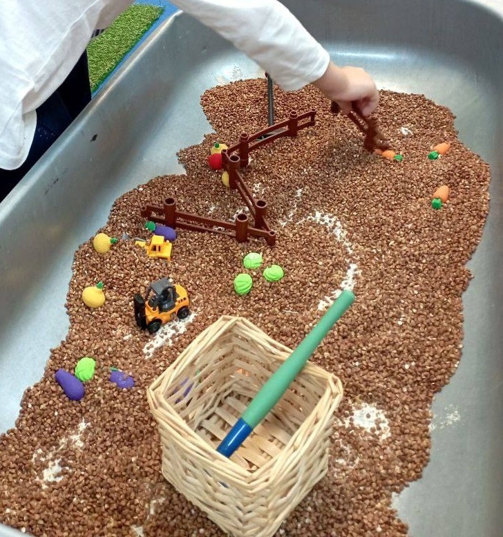 К каждому занятию я готовлю 3-5 разных сенсорных локаций, объединенные одной темой и раскрывающие разные свойства материалов. Использую разнообразные материалы: пищевые крупы, натуральные природные объекты, кухонные инструменты, жидкости и музыкальные инструменты. Смешиваю разные текстуры, чтобы сенсорная локация выглядела привлекательнее, добавляю пищевые красители: так обычные макароны могут стать