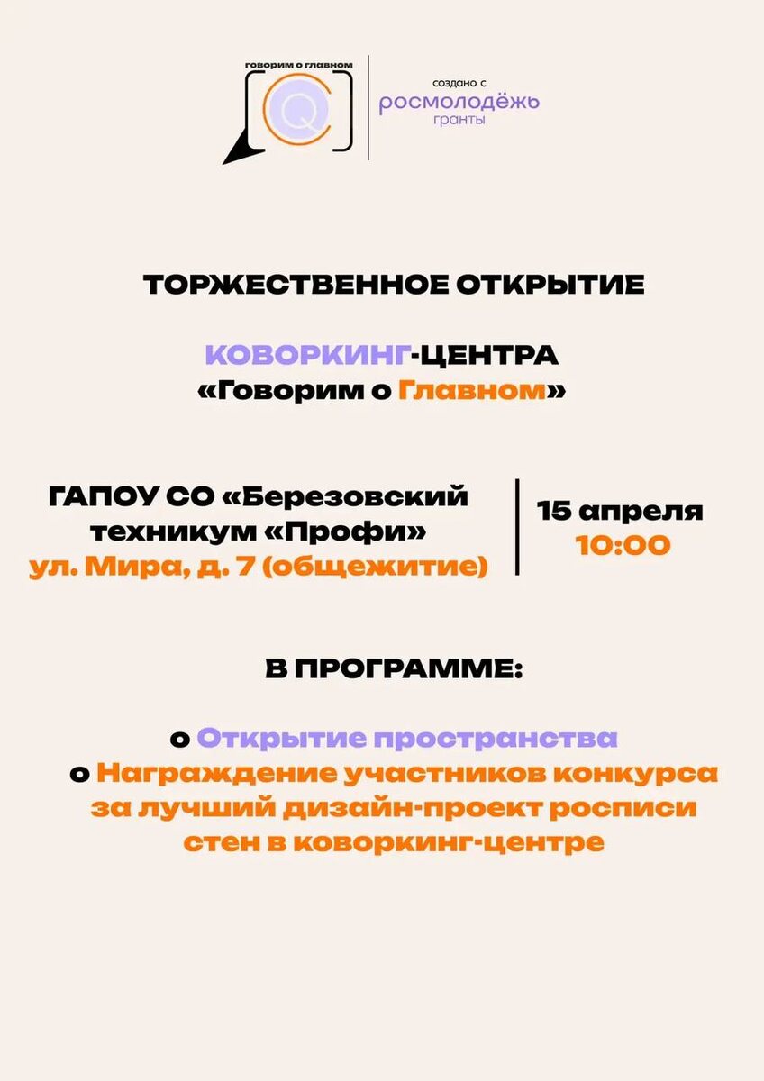 15 апреля в 10:00 в Березовском техникуме «Профи» (ул. Мира, 7, общежитие) состоится открытие современного коворкинг-центра «Говорим о главном». Новое пространство создано для поддержки студенческих инициатив, реализации проектов и объединения активной молодежи. В программе открытия: • Награждение победителей конкурса на лучший дизайн-проект росписи стен коворкинга. • Мастер-класс по сценической речи. • Презентация возможностей центра и экскурсия по его территории. Проект реализован при поддержке программы Росмолодёжь.Гранты.