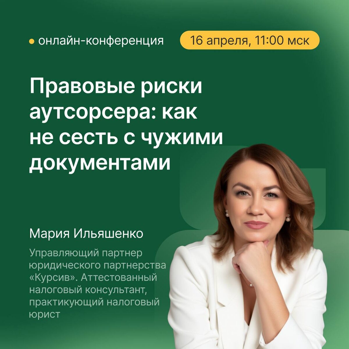 🔎 Знакомимся с ещё одним спикером нашей онлайн-конференции «Бухгалтерский аутсорсинг: от идеи к доходу» 🎙 Мария Ильяшенко Мария расскажет на что обратить внимание и как защитить себя юридически. 📣«Как не сесть с чужими документами: минимизируем правовые риски бухгалтера-аутсорсера» 📆16 апреля в 11:00 🔗 Регистрация