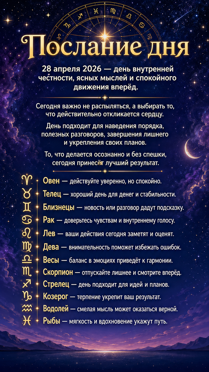 28 апреля 2026 — день внутренней честности, ясных мыслей и спокойного движения вперёд.