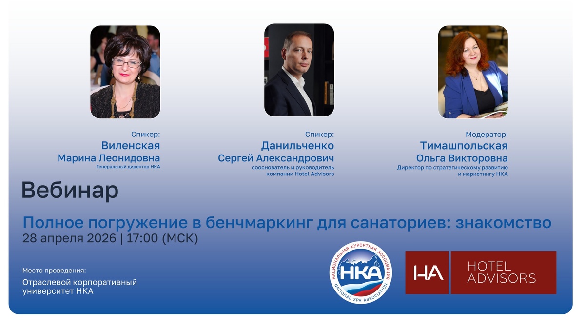 Какую пользу вы получите? Бенчмаркинг — это инструмент, который позволяет выйти за рамки внутренних отчетов. С его помощью вы сможете: 🔹Объективно сравнить свою загрузку и доход с показателями рынка. 🔸Видеть реальные тренды спроса и корректировать свои цены вовремя. 🔹Обосновывать управленческие решения цифрами, а не догадками. Главное событие встречи: Презентация системы аналитики, созданной специально для санаторно-курортных услуг. Это совместный проект НКА и лидеров рынка гостиничной аналитики Hotel Advisors. Наши эксперты: Марина Леонидовна Виленская — генеральный директор НКА. Сергей Данильченко — основатель и руководитель Hotel Advisors. Модератор — Ольга Викторовна Тимашпольская, директор по стратегическому развитию и маркетингу НКА. Это не просто теория. Это разговор про инструмент, который сделает ваш бизнес прозрачным и предсказуемым. 📅 Когда: 28 апреля в 17:00 (мск) 📍 Где: ОКУ НКА (вебинар) Переходите на новый стандарт управления вместе с лидерами отрасли! 🔗 Реги